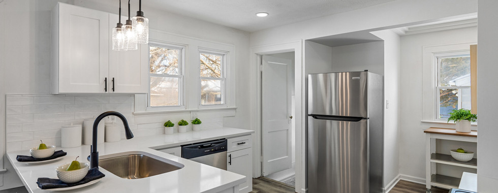✔️ Updated kitchen with soft-close cabinets, quartz counters, peninsula breakfast bar, tile backsplash, new plumbing fixtures, and lighting
